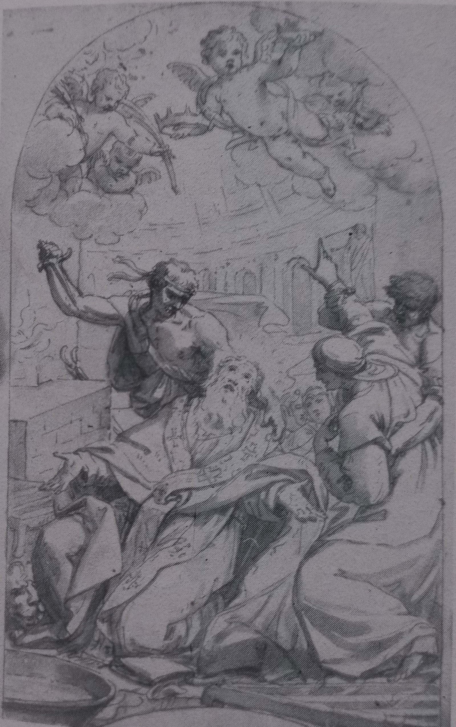 Il dipinto, datata e firmato, è conservato nel primo altare laterale destro della chiesa di San Giovanni della Pigna, nell'omonimo Rione di Roma. La piccola chiesa risale al X secolo ed era originariamente dedicata ai martiri Eleuterio e Genesio, il cui resti del corpo sono conservati sotto l'altare maggiore (M. Armellini, Le chiese di Roma dal secolo XIV al secolo XIX, Tipografia Vaticana, Roma 1891, p. 468). Poi la chiesa, caduta in rovina, nel 1584, venne concessa da papa Gregorio XIII all'Arciconfraternita della Pietà verso i carcerati, che la riedificò dalle fondamenta. Della costruzione della nuova chiesa fu incaricato l'architetto Torroni; terminata nel 1624, con il titolo di "Sancti Ionanis de Pinea". Il dipinto fu realizzato da Giacomo Zoboli (Modena 1681 - Roma 1767) nel 1738, snodo cruciale nella vita del pittore, perchè in quell'anno trasferì la sua abitazione e il suo laboratorio a palazzo Farnese, all'epoca di proprietà dei Borbone di Napoli: il privilegio gli era stato concesso dal re di Napoli Carlo di Borbone, su richiesta del cardinale Neri Maria Corsini (1685-1770) nipote di Papa Clemente XII. Zoboli era divenuto famoso a partire dal 1729, quando dipinse San Gerolamo ascolta la tromba del giudizio universale, nella basilica di Sant'Eustachio a Roma, grandemente apprezzato dai contemporanei. Le numerose commissioni del pittore modenese tra il 1727 e il 1740 nella città di Roma sono principalmente dovute allo stesso cardinale Neri Corsini. Il martire raffigurato nel dipinto è San Eleuterio vescovo, identificato con Eleuterio nato a Roma nel I secolo e martirizzato sempre a Roma con la madre Anzia durante la persecuzione dell'imperatore Adriano tra il 117 e il 120. Secondo le fonti greche del V e Vi secolo (BHG, I, pp. 173-74, nn. 568-71b) il Santo fu vescovo nell'Illirico, mentre per altre fonti latine fu vescovo in Puglia (BHL, I, p. 368, n. 2452). Questa è l'identificazione più accreditata, fatta propria anche da Maria Barbara Guerrieri Borsoi, Disegni di Giacomo Zoboli, De Luca, Roma 1984, p. 33. Tuttavia a Roma era anche diffuso il culto di Sant'Eleuterio di Arce, nato in Inghilterra e morto nel V secolo. Secondo la tradizione era andato in pellegrinaggio in Terra Santa e durante il ritorno era morto ad Arce, in provincia di Frosinone, dove un oste gli rifiutò l'ospitalità e gli aizzò contro i suoi cani, i quali però si ammansirono subito alla vista del santo. Il mattino succesivo, non lontano dalla taverna, fu trovato il corpo del pellegrino morto, custodito dai mastini. Il pellegrino subito fu acclamato santo dalla popolazione, che lo elevò a patrono della città (le reliquie del santo sono conservate tuttora in un'urna sotto l'altare a lui dedicato nella chiesa parrocchiale dei Santi Apostoli Pietro e Paolo di Arce). E' invece da escludere l'identificazione con Sant'Eleuterio Papa (che fu il 13° pontefice, verso la fine del II secolo) perché non risulta sia stato martirizzato. Almeno sei disegni di Zoboli mostrano lo scrupoloso lavoro preparatorio del pittore modenese (M. B. Guerrieri Borsoi, Disegni di Giacomo Zoboli, pp. 33-34 e 88-89). disegno finale per il dipinto del martirio di sant'Eleuterio (tratto da M. B. Guerrieri Borsoi, Disegni di Giacomo Zoboli, p. 89, dis. n. 54) Si può verosimilmente supporre che Zoboli abbia tratto ispirazione anche dal Martirio di San Federico (1651) di Giacinto Brandi, conservato allora nella quarta cappella di destra, dedicata a San Federico di Utrecht, nella basilica di Santa Maria in Trastevere a Roma (oggi il dipinto di Brandi è collocato negli uffici parrocchiali della chiesa).