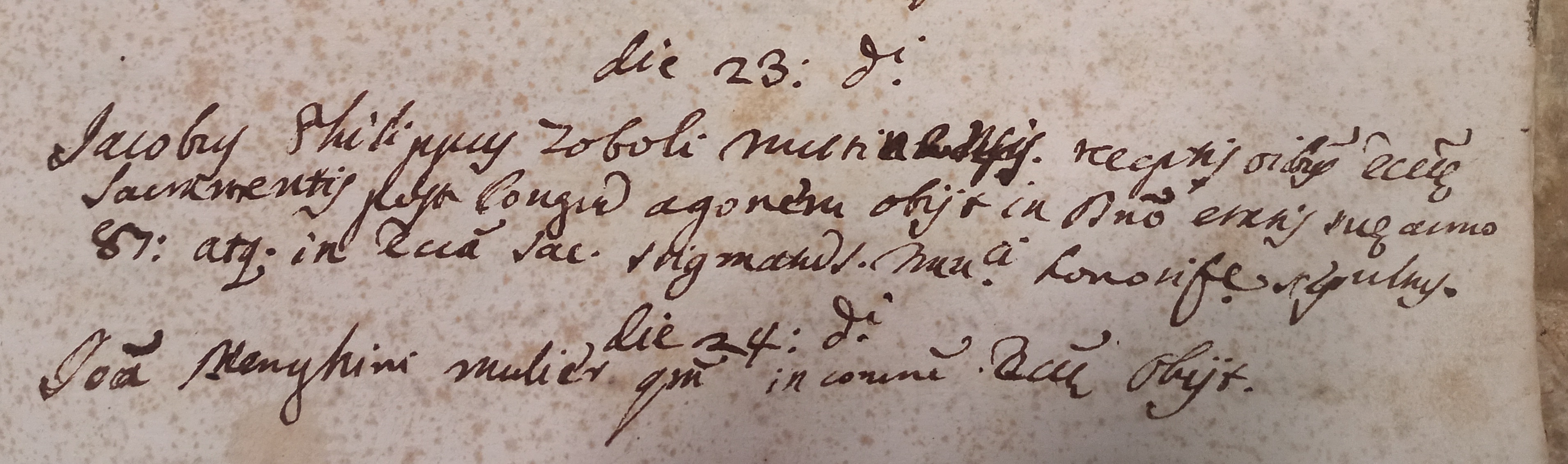 Historical Archive of the Vicariate of Rome Fondo Arciconfraternita delle Sacre Stimmate di San Francesco di Roma Uffici dei fratelli defunti 1759-1784 (vol. 526) dated February 24, 1767 " in mattina, essendo stato esposto il cadavere del fr. Giacomo Zoboli, ivi gli fu recitato tutto il Santo Uffizio per il medesimo e dispensate le candele date dagli eredi del medesimo. " (In the morning, the body of Brother Giacomo Zoboli having been exposed, the entire Holy Office was recited for him and the candles given by his heirs were dispensed.)
